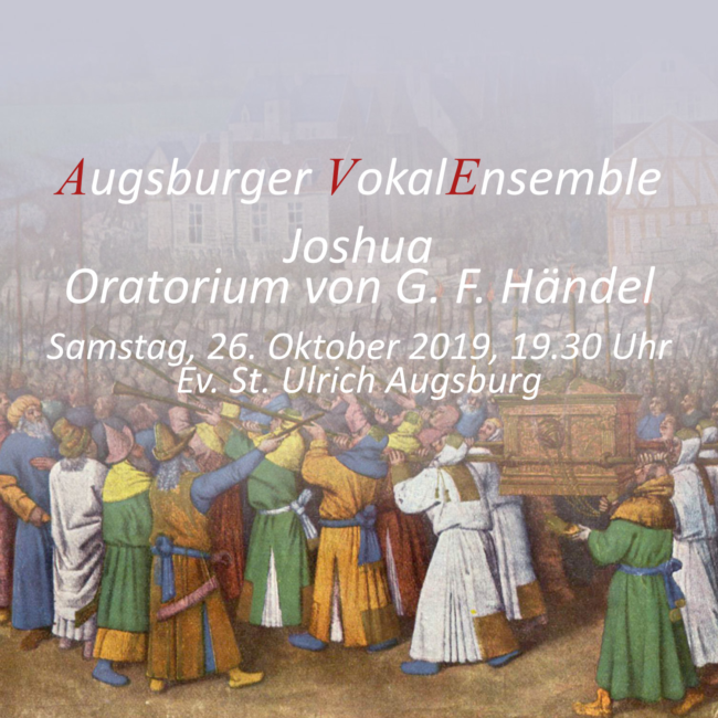 Samstag, 26.10.2019, 19.30 Uhr Evangelisch St. Ulrich JoshuaOratorium von Georg Friedrich Händel Leitung: Alfons Brandl Augsburger Vokalensemble (Einstudierung Alfons Brandl) Franziska Zwink, Sopran Kiuk Kim, Altus Daniel Thomas, Tenor Jakob Kress, Bass Presse. Die AZ war voll des Lobes für die Aufführung, die in historischer Aufführungspraxis stattfand und schrieb mit einer Aufführung von vor sechs…